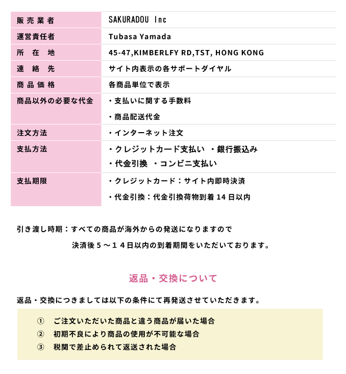 特定商取引法に基づく表示 | ご利用ガイド | 海外個人輸入代行通販サイトさくら堂